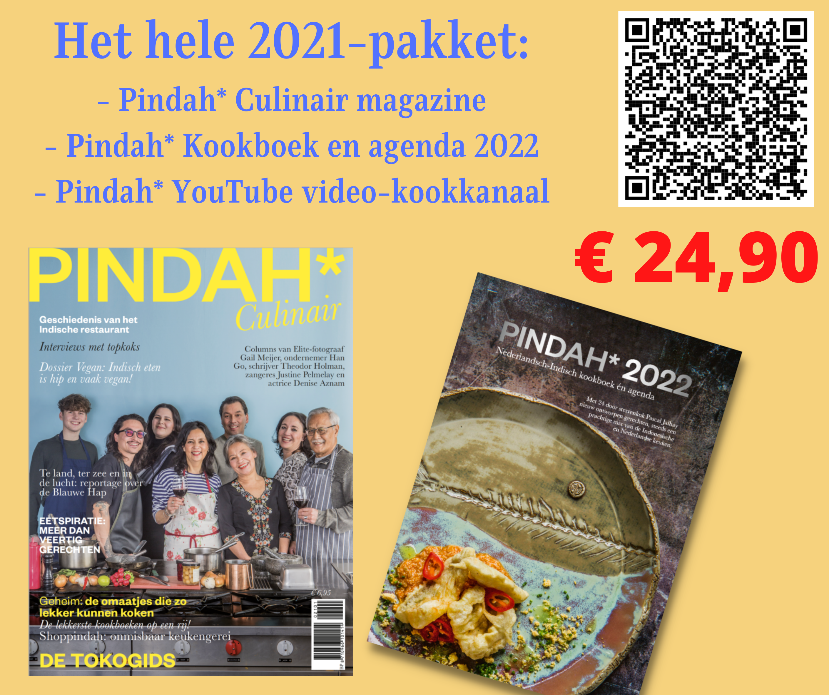 Het was een lange aanloop maar vandaag is het zover, vanaf woensdag 4 augustus 2021 liggen er exemplaren van Pindah* Culinair in duizenden verkooppunten in ons land. Bij Bruna, AKO, Readshop, Primera, de supermarkten, de vakboekhandel: letterlijk overal. Een greep uit de inhoud Meer dan 40 recepten met prachtige fotografie