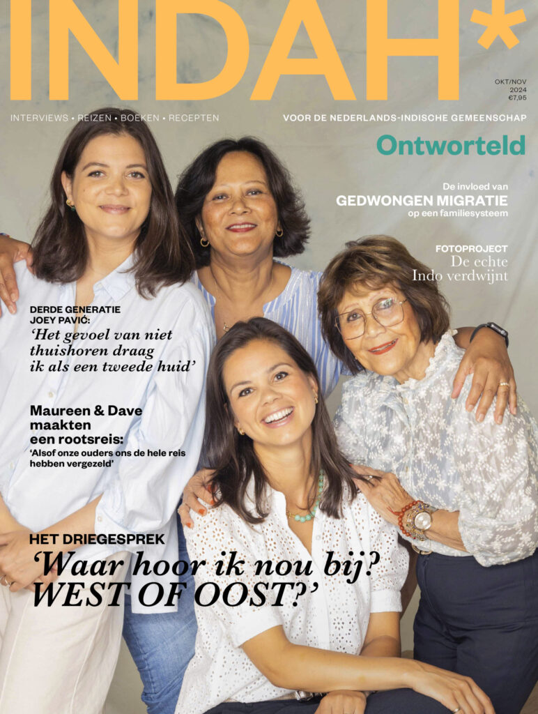 De nieuwste Indah heeft als thema ‘Ontworteld’. Je nergens thuis voelen. Omdat je je geboortegrond in allerijl moest verlaten. Zonder bewust afscheid te hebben kunnen nemen van alles wat je lief was: je huis, je omgeving, je vrienden, de geuren en geluiden. Een stukje van je hart heb je daar achtergelaten, het andere stukje is meegekomen naar Holland, gevuld met verdriet en heimwee. Dit trauma, want dat is het, wordt doorgegeven. Niet iets waar je vrolijk van wordt. En dan is daar Anne, met een zin in haar eerste Indah column die me naar de strot grijpt: “Wie voorbij verlies van eigen land, geliefden en identiteit heeft leren overleven, kan niet anders dan mateloos krachtig zijn.”